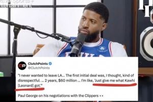 他当时说:“我从未想过离开洛杉矶。他们最开始给我的合同,我想那有些不尊重人,2年6000万。我说,‘给我莱昂纳德得到东西。’”
